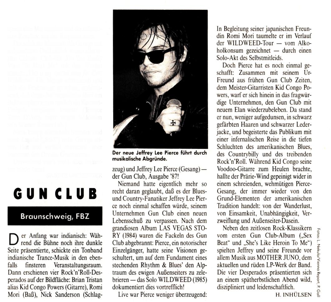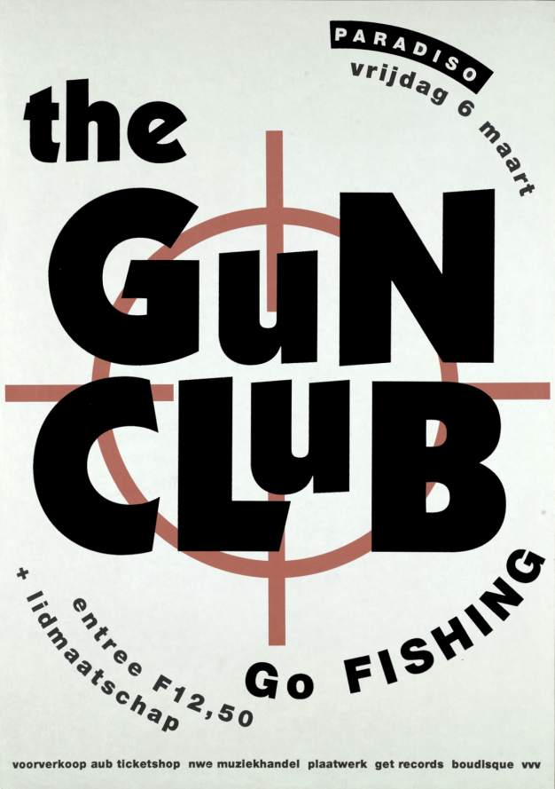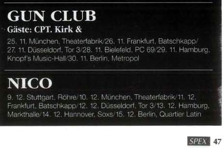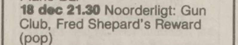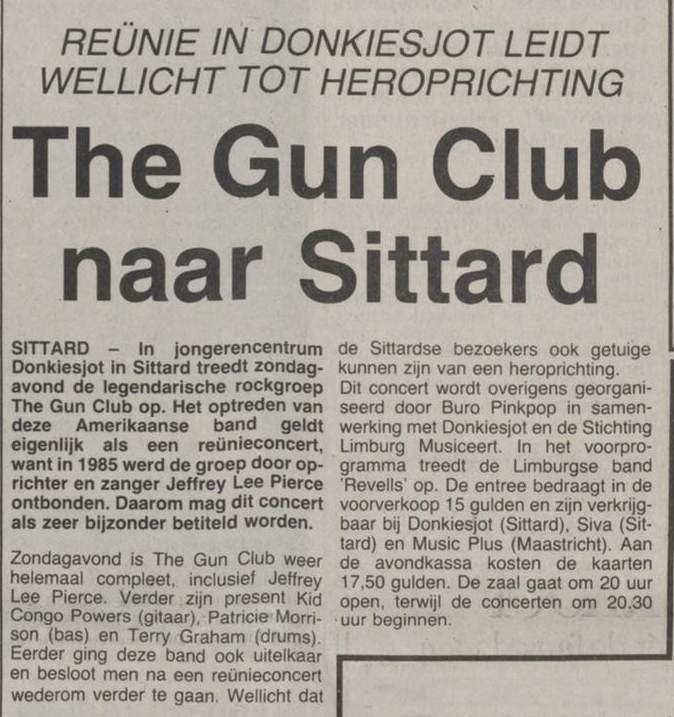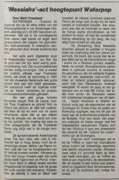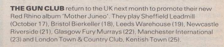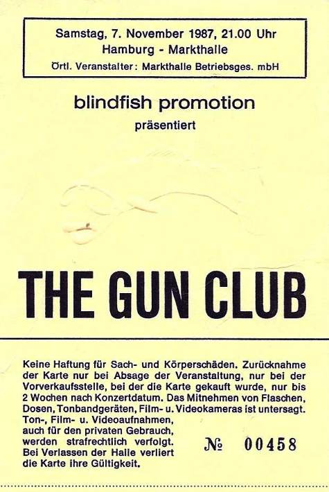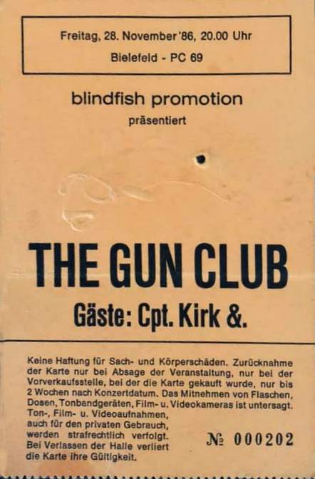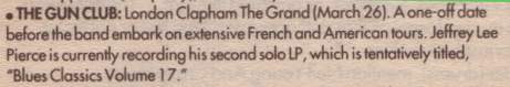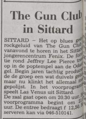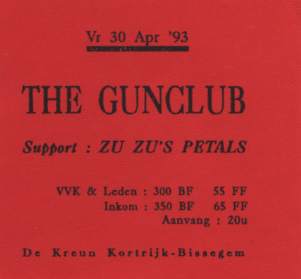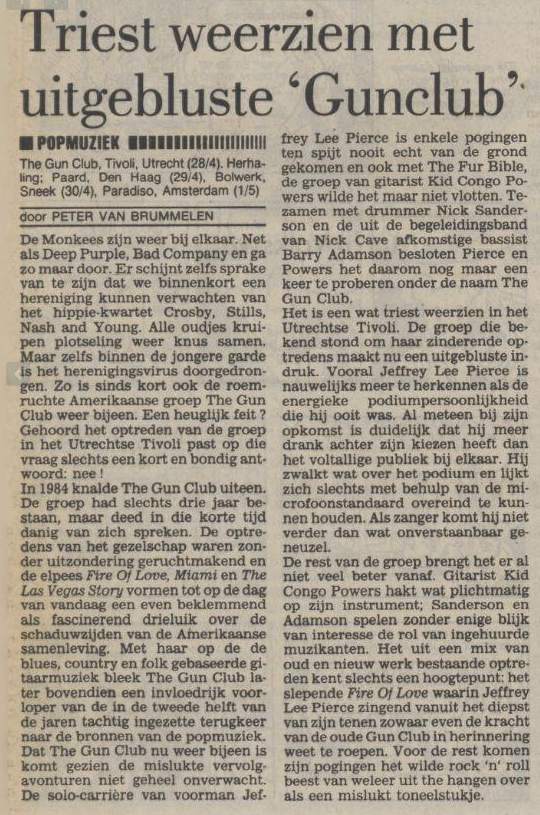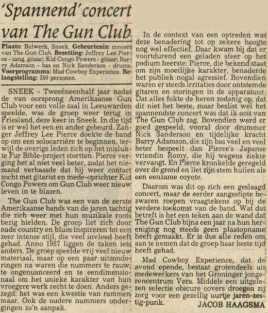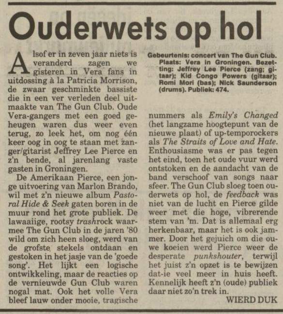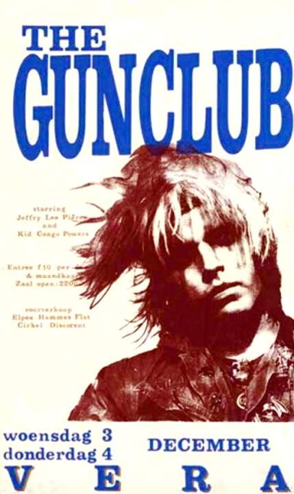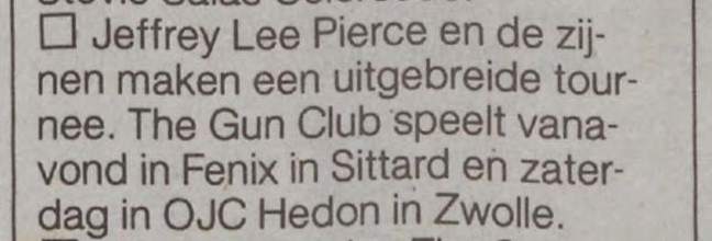 30-Apr-87 Review: Taken from Leeuwarder Courant 01-May-87. "In addition, there were several irritations due to detuned guitars and malfunctions in the equipment. All this stirred up the guys in such a way that this was not the best, but certainly the most exciting concert I ever saw from The Gun Club. In addition, they played well, especially by drummer Nick Sanderson and temporary worker Barry Adamson, who plays his bass much, much better than Pierce's Japanese girlfriend Romi [...] And Pierce writhed regularly on the stage floor, howling like a lone coyote. That is why this was a successful concert, but the previously mentioned objections raise questions about the further future of the band. In that respect, it's writing on the wall that The Gun Club still hasn't made a record almost a year after their reunion. There is therefore every reason to believe that the group has had its day." Three months later the Gun Club would start the recording sessions for their masterpiece "Mother Juno" album. |