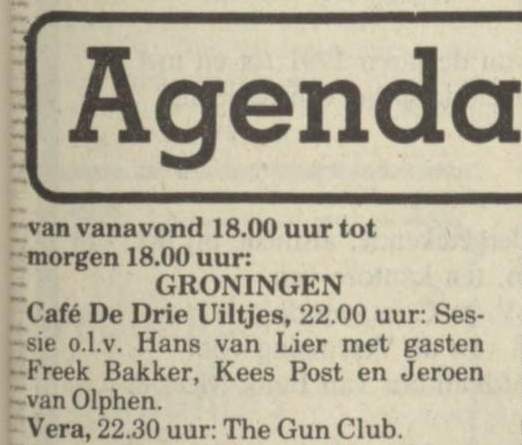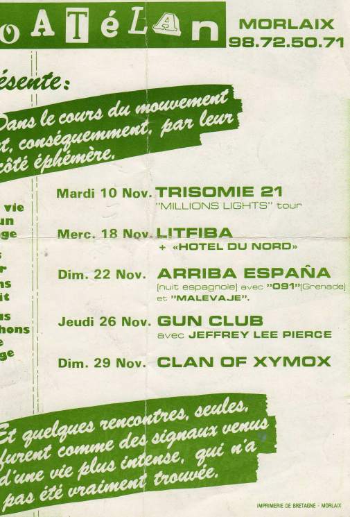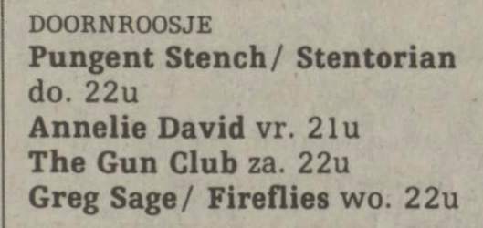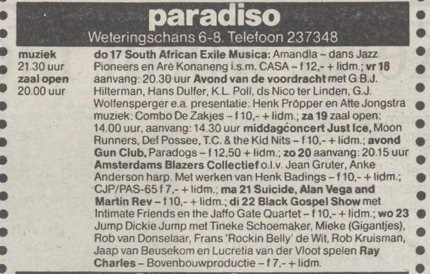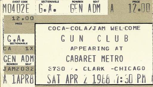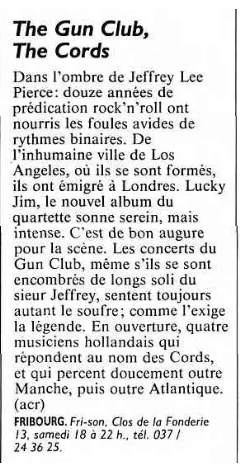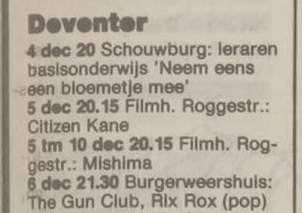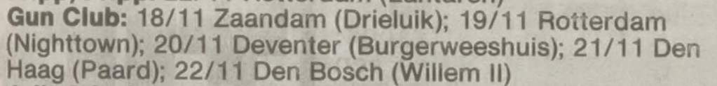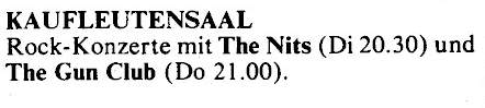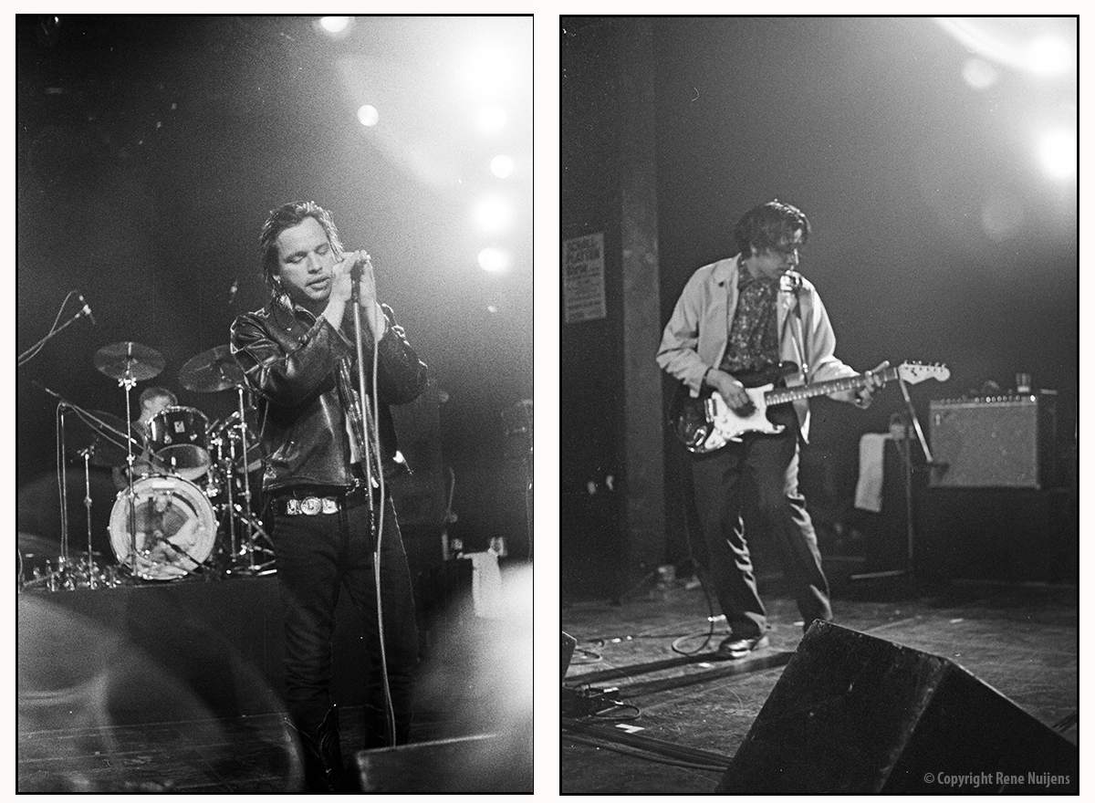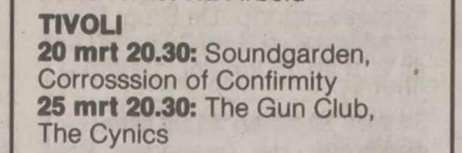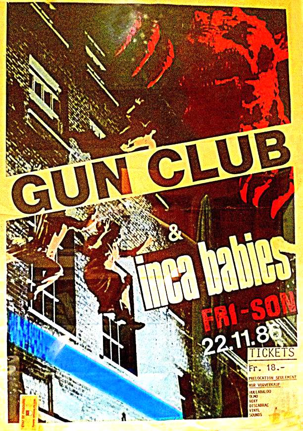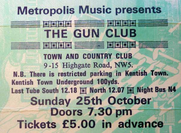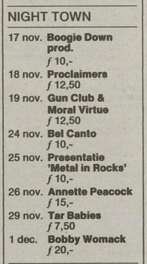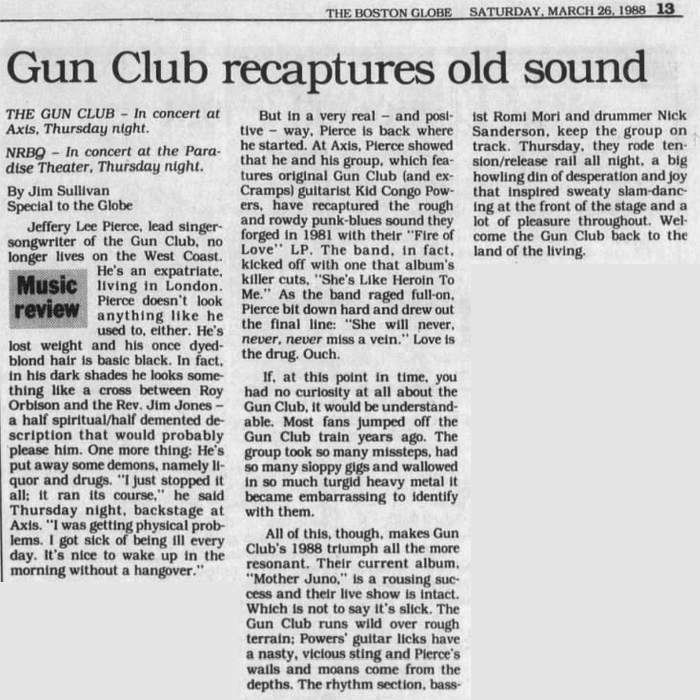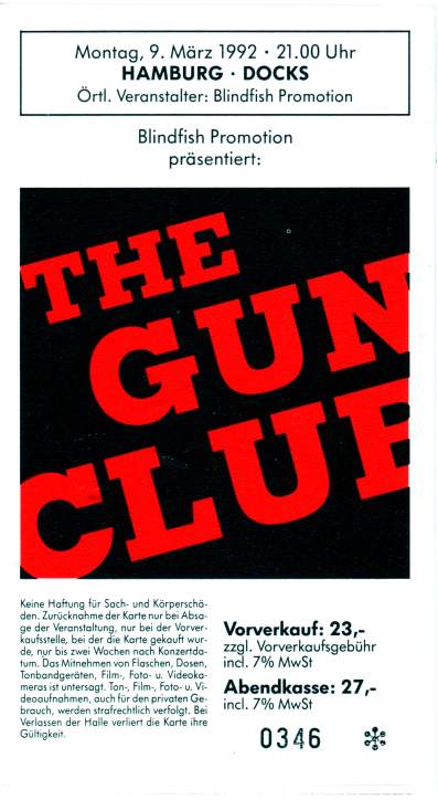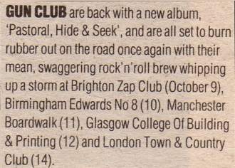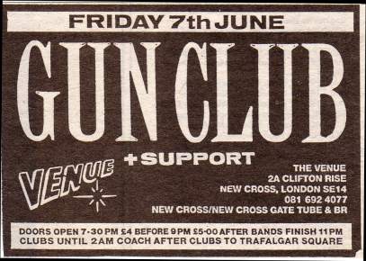 30-Apr-87 Review: Taken from Leeuwarder Courant 01-May-87. "In addition, there were several irritations due to detuned guitars and malfunctions in the equipment. All this stirred up the guys in such a way that this was not the best, but certainly the most exciting concert I ever saw from The Gun Club. In addition, they played well, especially by drummer Nick Sanderson and temporary worker Barry Adamson, who plays his bass much, much better than Pierce's Japanese girlfriend Romi [...] And Pierce writhed regularly on the stage floor, howling like a lone coyote. That is why this was a successful concert, but the previously mentioned objections raise questions about the further future of the band. In that respect, it's writing on the wall that The Gun Club still hasn't made a record almost a year after their reunion. There is therefore every reason to believe that the group has had its day." Three months later the Gun Club would start the recording sessions for their masterpiece "Mother Juno" album. |