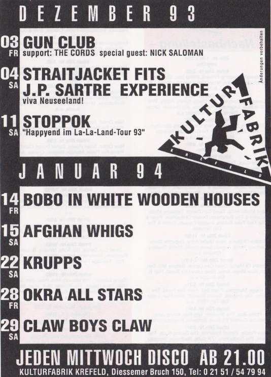 19-May-94 Note: Cancelled by a note on the door, although Jeffrey had made it to London by then. He was present at the Bad Seeds BBC TV Later session on 14-May-94 and at their Shepherd's Bush concert of the 20th he again guests on vocals. |