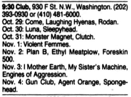 02-Nov-93 03-Nov-93 Note: The show in Baltimore had to be cancelled due to the 16 hour drive from Toronto, which made it impossible to get there in time. |