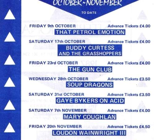19-Oct-87 Setlist: Walking With The Beast/ Bad Indian/ My Cousin Kim/ Thunderhead/ Like Calling Up Thunder/ Lupita Screams/ Yellow Eyes/ Hearts/ Fire Spirit/ Fire Of Love [Jody Reynolds]/ Bill Bailey/ Ghost On The Highway/ Sleeping In Blood City/ Moonlight Motel/ She's Like Heroin To Me/ Crab Dance. |