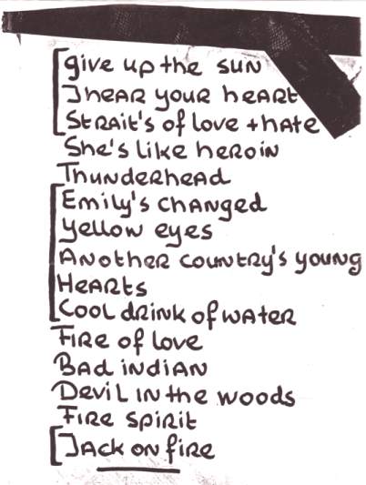 17-Oct-87 Setlist: Walking With The Beast/ Bad Indian/ My Cousin Kim/ Thunderhead/ Fire Of Love/ Lupita Screams/ Yellow Eyes/ Hearts/ Fire Spirit/ Bill Bailey/ Ghost On The Highway/ Sleeping In Blood City/ Crab Dance/ She's Like Heroin To Me. |