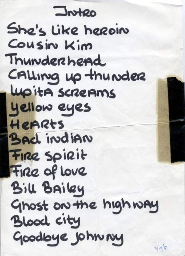 04-Nov-87 Setlist: Bad Indian/ My Cousin Kim/ Thunderhead/ Like Calling Up Thunder/ Lupita Screams/ Yellow Eyes/ Hearts/ Walking With The Beast/ Fire Spirit/ Fire Of Love [Jody Reynolds]/ Bill Bailey/ Ghost On The Highway/ Sleeping In Blood City/ Crab Dance/ She's Like Heroin To Me/ Moonlight Motel. |