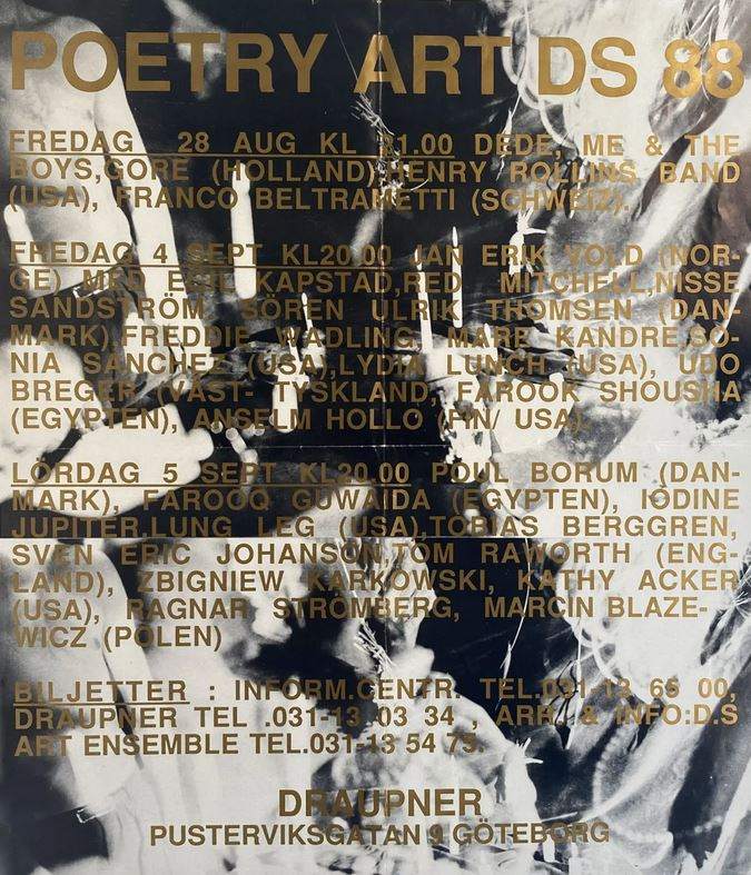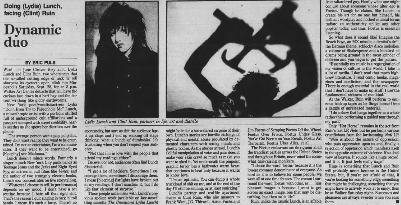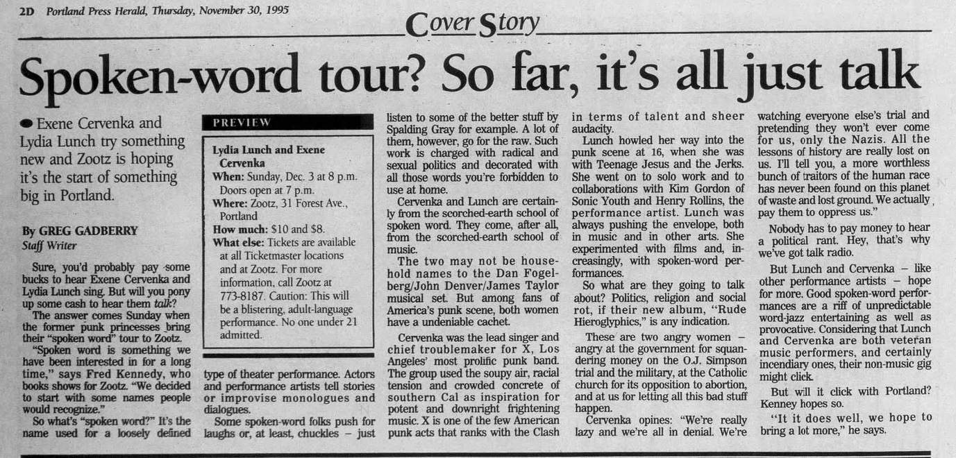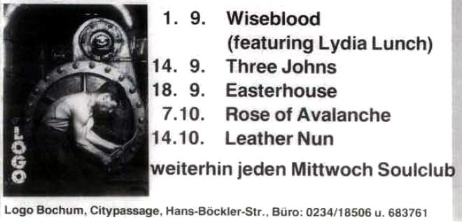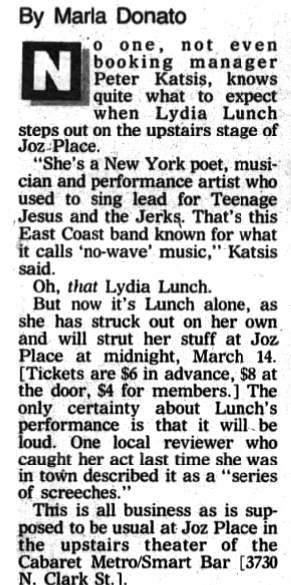 Note: Part of a US reading tour. Lydia Lunch with Jim Sclavunos (sax/keyboard) and pre-recorded backing tapes. Setlist also included tracks from the "In Limbo" mini album (recorded November 1982, released September 1984).