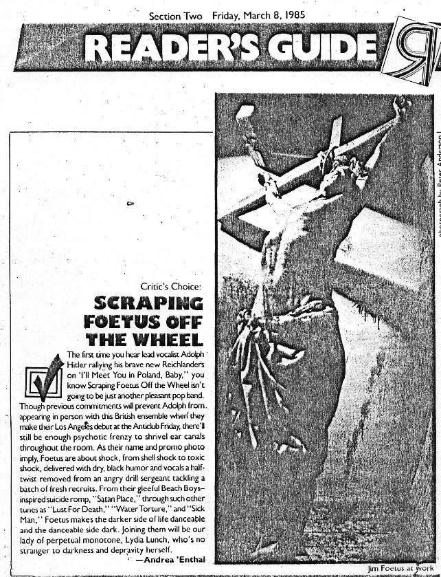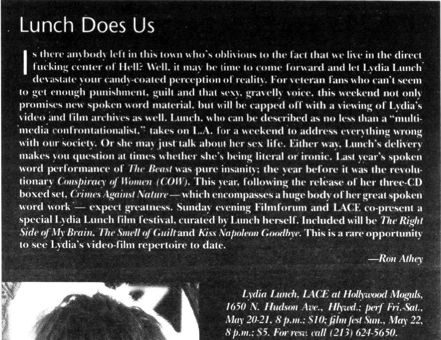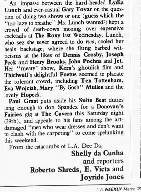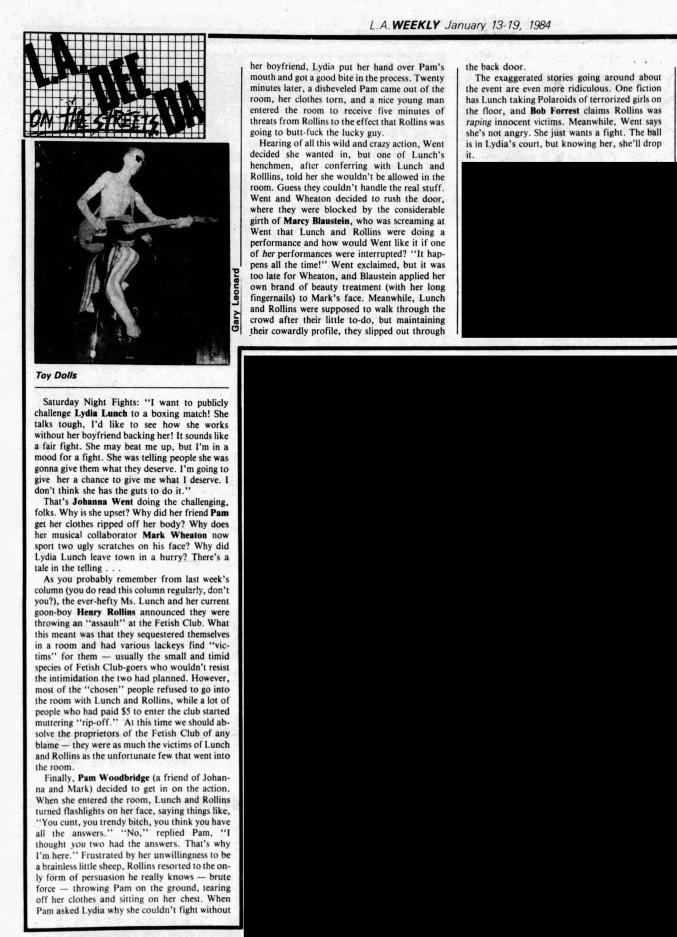 Note 2: L.A. Weekly's "La Dee Da" column the next weeks were full of outrage directed at Lunch and Rollins. LA Weekly 13-Jan-84 and LA Weekly 03-Feb-84 and LA Weekly 17-Feb-84.
