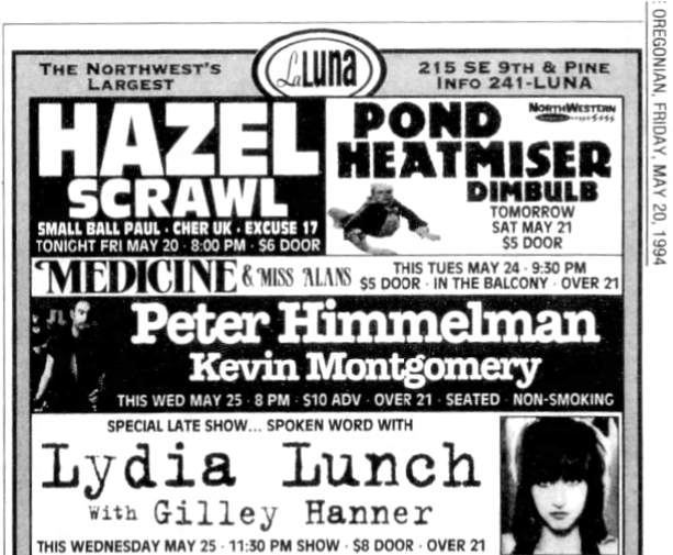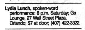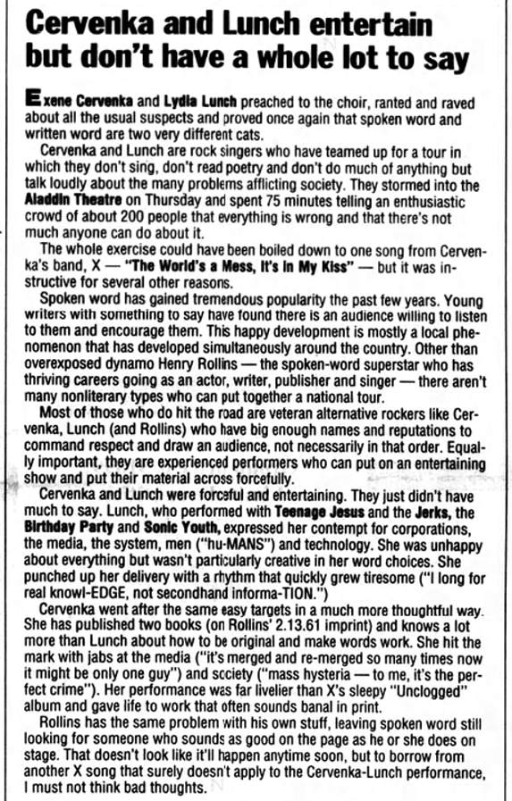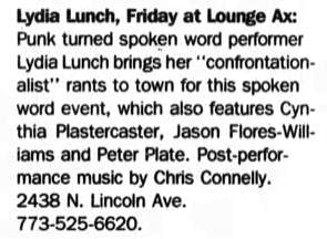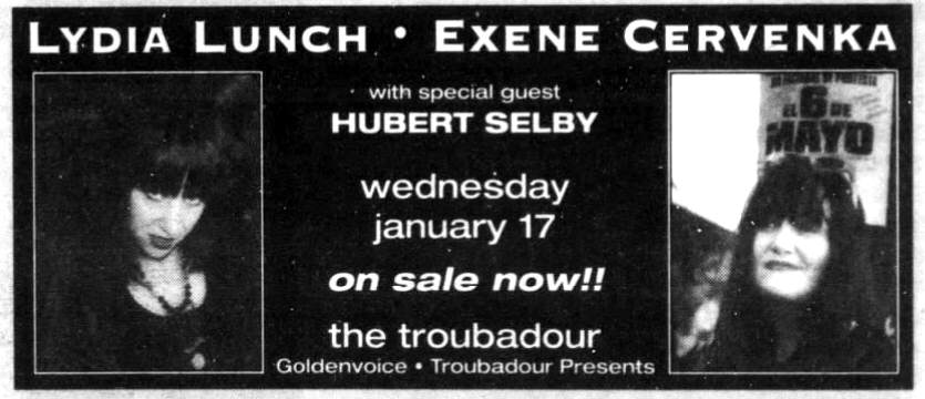 Note: Henry Rollins [Black Flag] attends the show. Lydia calls him up the next day. This is when their collaboration starts.