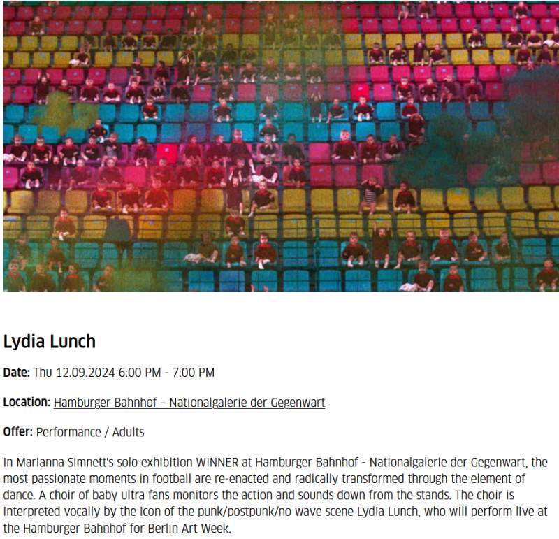 Note: In Marianna Simnett's multichannel film installation WINNER, the most passionate moments in football are re-enacted and radically transformed through the element of dance. A choir of baby ultra fans monitors the action and sounds down from the stands. The choir is interpreted vocally by the icon of the punk/postpunk/no wave scene Lydia Lunch, who will perform live at the Hamburger Bahnhof for Berlin Art Week.
