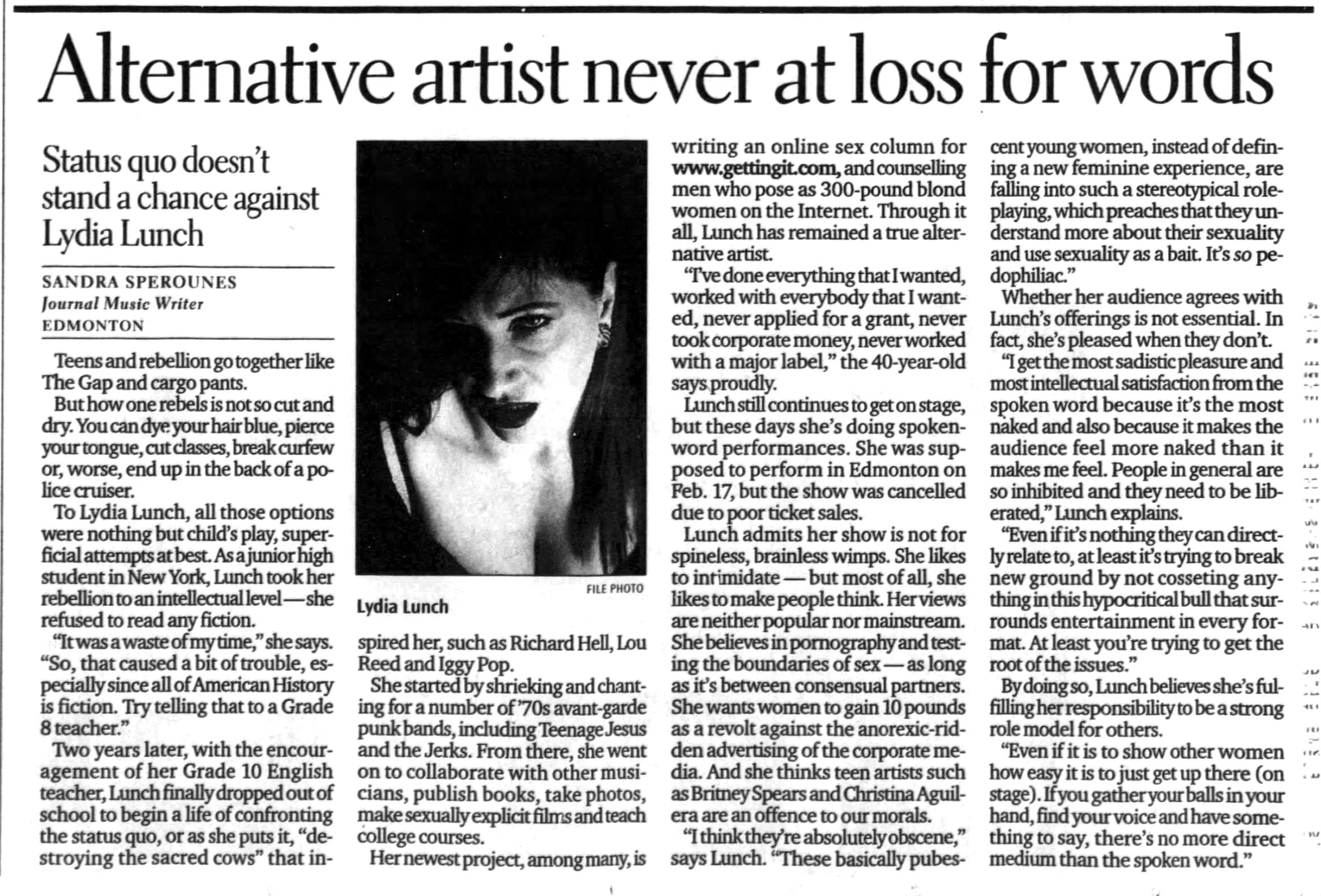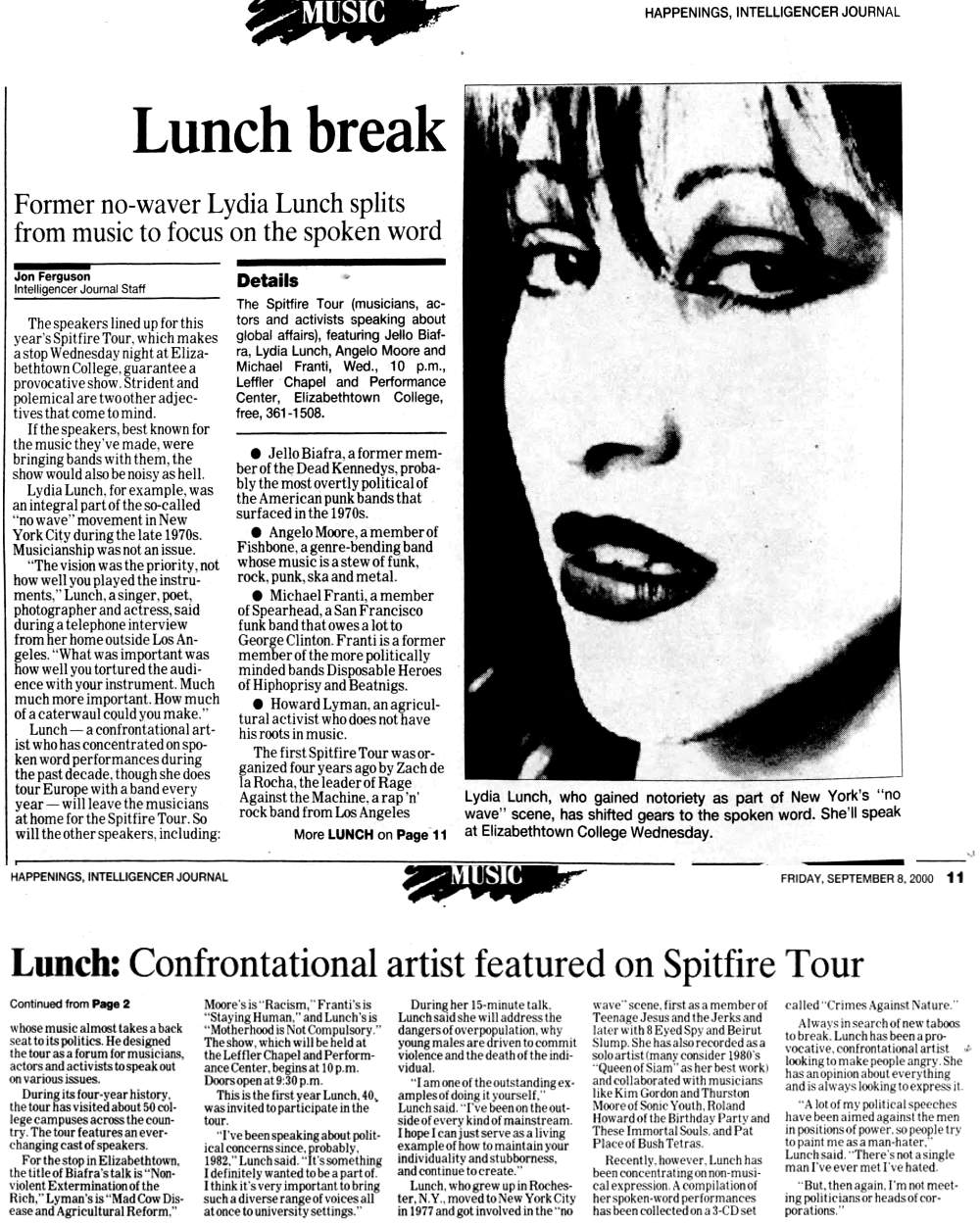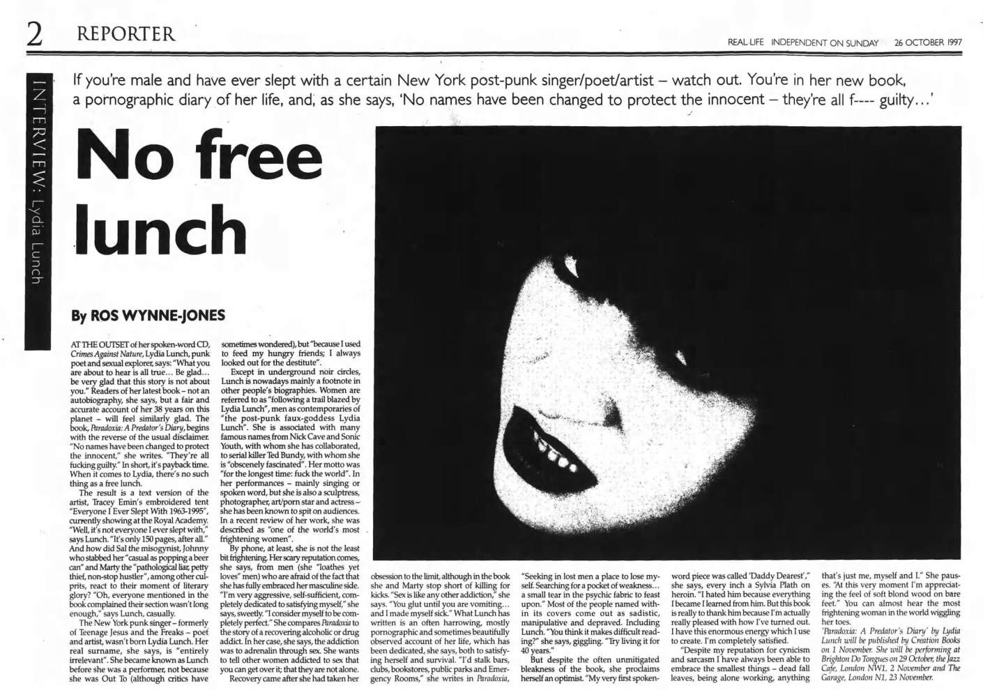 Note: (*) Broadcast on Canadian CKLN radio as part of a one hour interview with Lydia Lunch.
