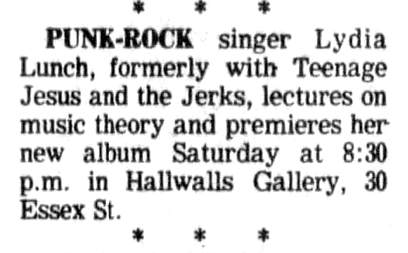 Note: Lydia doing a lecture on "Music Theory" and presenting her "Queen of Siam" album (ZE Records). On 20-Nov-79 Vivienne Dick screens her "Beauty Becomes The Beast" Super-8 film (41 mins) in which Lydia Lunch has the main role.