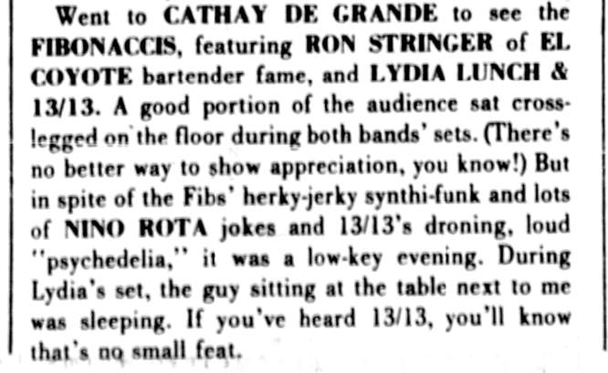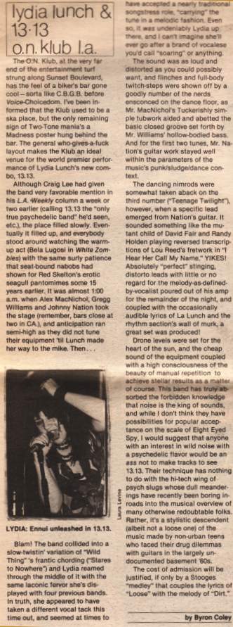 Article: Scan of Pleasant Gehman's column "L.A. Dee Da - On The Streets" from LA Weekly 24-Jul-81. "Johnny Nation is out of 13.13, and the new guitarist for Lydia Lunch's band is Dix Denney, formerly of the Weirdos. Since bassist [Greg] was also in the Weirdos, as well as drummer Cliff Martinez, it seems that Lydia is the only group member not to have been a Weirdo, though some might call her that. The new 13.13 lineup can be seen at the Whisky this weekend." |