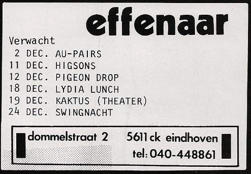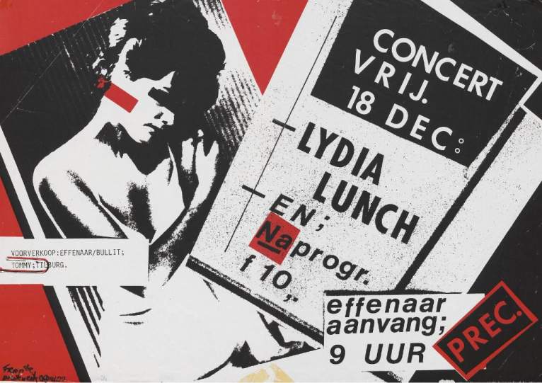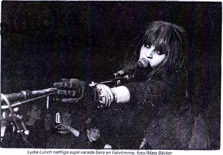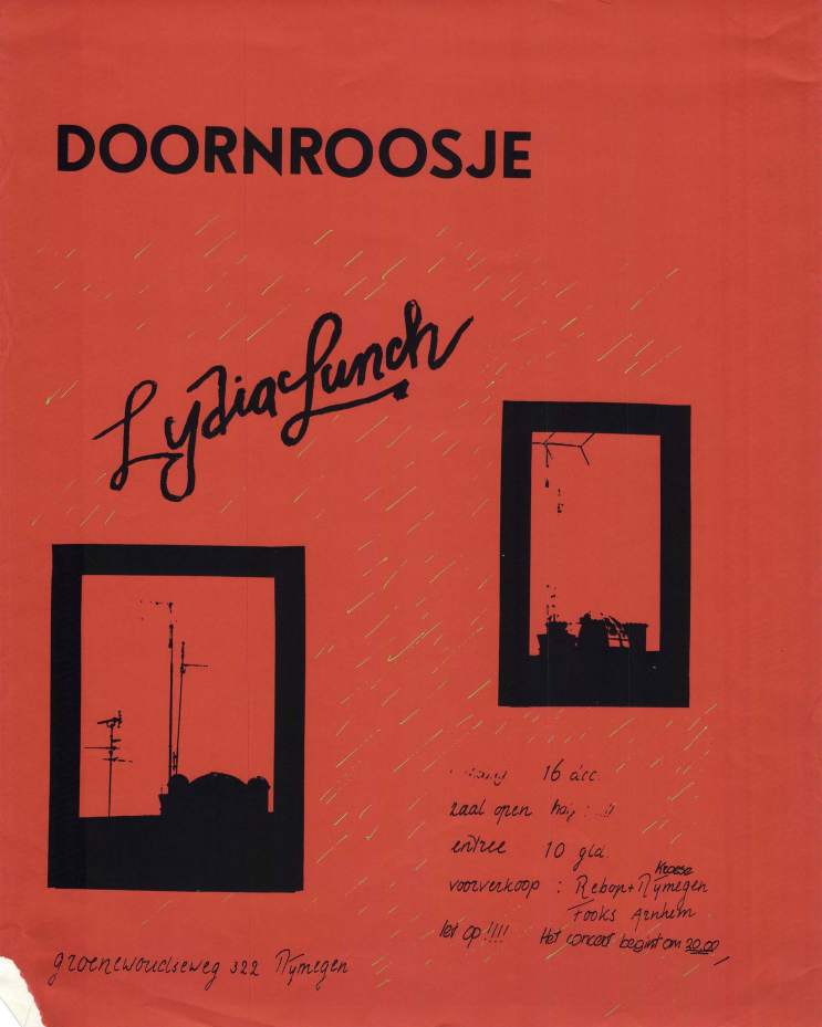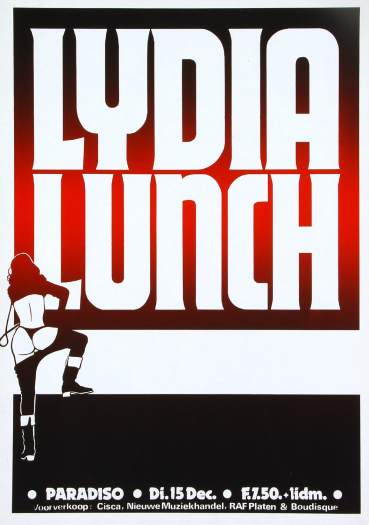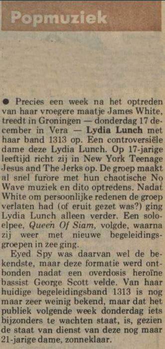 Review: Taken from Nieuwsblad van het Noorden 19-Dec-81. "[...] The spectacle lasted exactly half an hour. In fact, one long song, monotonous, provocatively annoying, tasteless outburst of non-music, which had the unmistakable intention of being irritating, of offending people and which completely succeeded. In the past, Lydia Lunch has more than proven that she is not someone who is a follower. Averse to clichés, she flouted all conceivable conventions. As a poet who set her products to unusual and intriguing music, she rightly became one of the most important figures in the so-called New York No Wave movement. [...] However, what Lydia Lunch now thinks she can create shows a gross disregard for her audience. Under the guise of art (whatever that may be) she displayed a piece of musical ignorance that made you feel sick. Waddling like a stoned witch, she hummed her lyrics through the microphone, extremely tired and completely unintelligible. And this against a backdrop of a heavy and gothic wall of sound constructed by a guitarist who could only play everything in a distorted E-minor and in C, and a drummer who also did not vary any of his playing". |