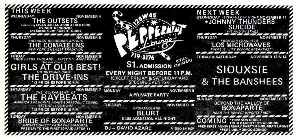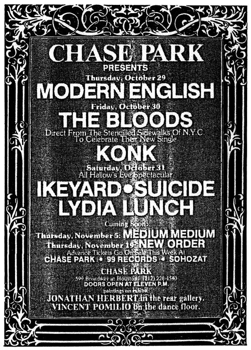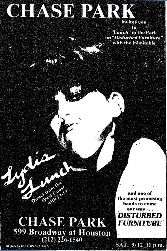 02-Oct-81 Note: A Birthday Party show attended by about 20-30 people, including Lydia Lunch [then in 13.13], who meets the band backstage. Lydia would open for The Birthday Party at two of their UK concerts in November 1981. The Chase Park (a slightly Bowie- "Diamond Doggish" affair) was atop an old Chase Bank @ 622 Broadway on the south west corner of Broadway and Houston. |