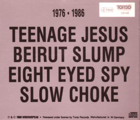 Recording info: Teenage Jesus & The Jerks: track 2 recorded in a studio, New York City in Feb-78. Produced by Robert Quine [The Voidoids]; track 3 recorded @ the Big Apple studios, New York City in May-78. Produced by Brian Eno; tracks 6-8 recorded in a studio, New York City in the second half of 1978. Produced by Robert Quine [The Voidoids]; rest live @ CBGB's, New York City 17-Jan-1979; Beirut Slump: tracks 1,2,5 and 8 recorded @ Hothouse studio, New York City on 08-Dec-78. Produced by Woody Payne (a.k.a Charles Ball), rest live @ the Mudd Club, New York City June 1979 at their last (of only 3 concerts); Eight Eyed Spy: tracks 1,2,6 and 7 recorded @ Blank Tapes Studios, New York City in Oct-1980. Produced and engineered by Bob Blank. Remixed @ 39th Street Music Studio, New York City in Oct-1980 by Scott Lit and Chris Stamey (with Pat Irwin and Jim Sclavunos), tracks 3,4 and 5 recorded live @ New Place, New Orleans on 25-Jul-80, track 8 recorded live @ Tier 3, New York City 31-Jan-80. Collaborations: see elsewhere. All recordings reprocessed by Jim G.Thirlwell in 1986.