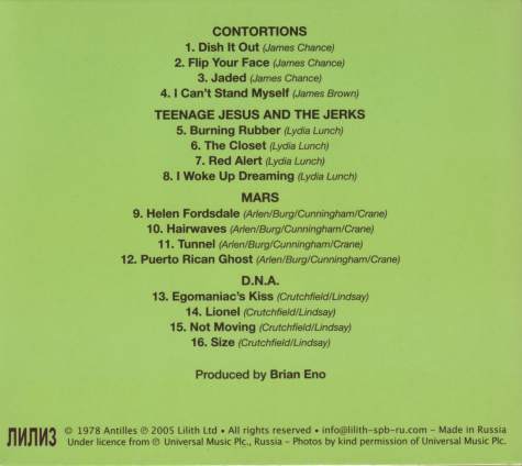 Tracklist: The Contortions: Dish It Out/ Flip Your Face/ Jaded/ I Can’t Stand Myself, Teenage Jesus and The Jerks: Burning Rubber/ The Closet/ Red Alert/ I Woke Up Dreaming// Mars: Helen Fordsdale/ Hairwaves/ Tunnel/ Puerto Rican Ghost, DNA: Egomaniac’s Kiss/ Lionel/ Not Moving/ Size.