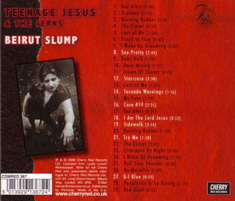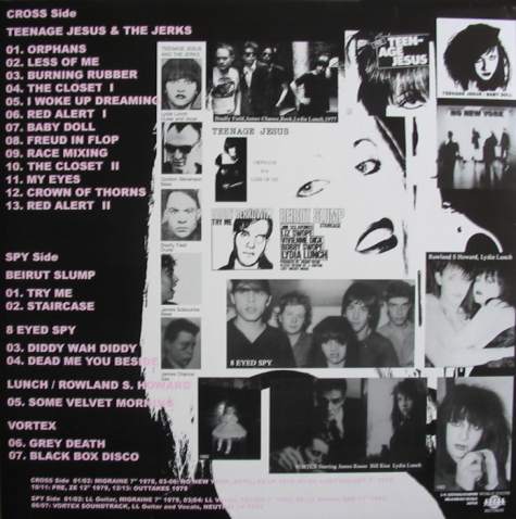 Tracklist: Teenage Jesus & The Jerks: 1.Red Alert(live)/ 2.Orphans/ 3.The Closet/ 4.Burning Rubber(live)/ 5.I Woke Up Dreaming/ 6.Freud In Flop/ 7.Baby Doll/ 8.Race Mixing/ 9.Crown Of Thorns(live)/ 10.Red Alert(live)// Beirut Slump: 1.Try Me/ 2.Staircase/ 3.I Am The Lord Jesus(live)/ 4.Case #14(live)/ 5.See Pretty/ 6.G-I Blue(live)/ 7.Tornado Warnings(live)/ 8.Sidewalk/// Eight Eyed Spy: 1.Swamp/ 2.Run Through The Jungle/ 3.Motor Oil Shanty(live)/ 4.Love Split With Blood(live)/ 5.Ran Away Dark(live)/ 6.Diddy Wah Diddy/ 7.Lazy In Love/ 8.Dead Me You Beside (a.k.a. Get You Me B Side)(live)// Collaborations: 1.I Fell In Love With A Ghost (with Rowland S.Howard)/ 2.Der Karibische Western (with Die Haut)/ 3.As She Weeps (with Sort Sol)/ 4.Death Valley ’69 (with Sonic Youth ["Bad Moon Rising" album version])(*).