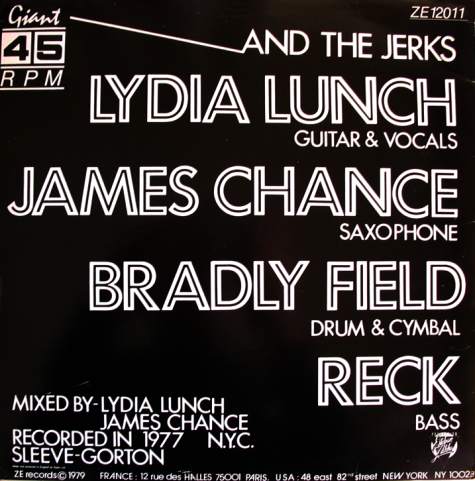 Line-up: Lydia Lunch (guitar and vocals)/ James Chance (saxophone on side 2)/ Reck (bass) and Bradly Field (1 drum and 1 cymbal).