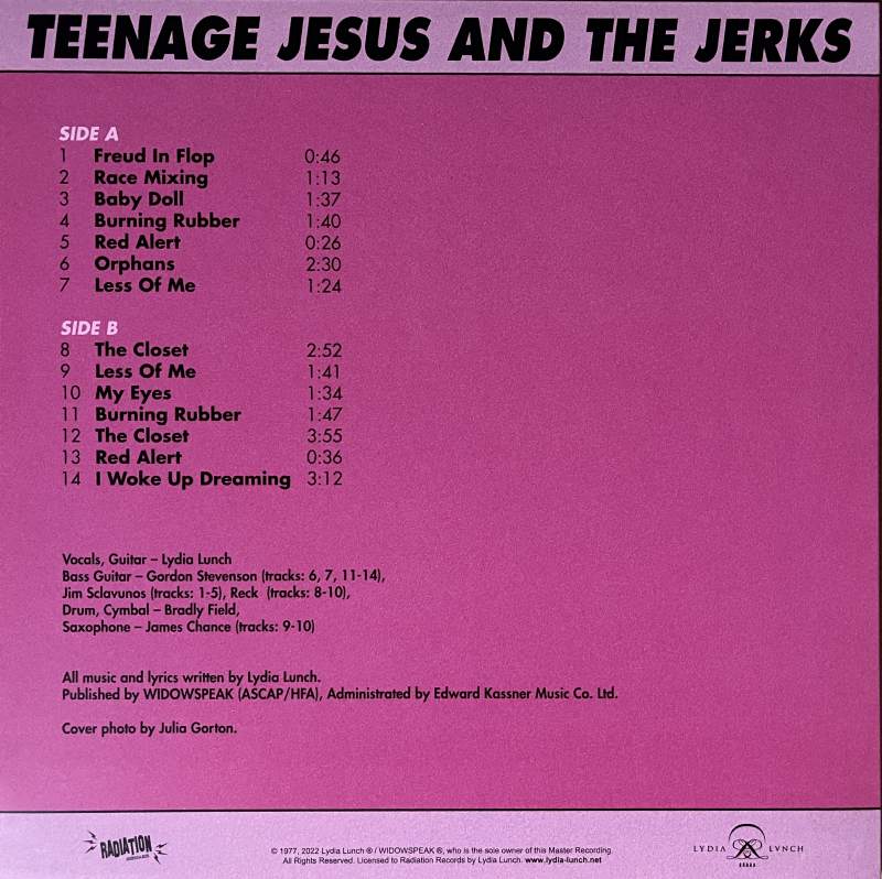 Notes: Earliest recording of Lydia Lunch. First recordings of Teenage Jesus & The Jerks when James Chance was still in the band. Different version of "Less Of Me" than the one on the first single. Cover photo by Julia Gorton.