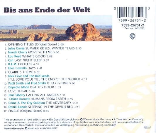 Tracklist: Nick Cave and the Bad Seeds: (I'll Love You) Until The End Of The World/ and tracks by Julee Cruise, Neneh Cherry, Lou Reed, Can, R.E.M., Elvis Costello, Patti Smith, Depeche Mode, Jane Siberry, T-Bone Burnett, Crime and the City Solution & Daniel Lanois.