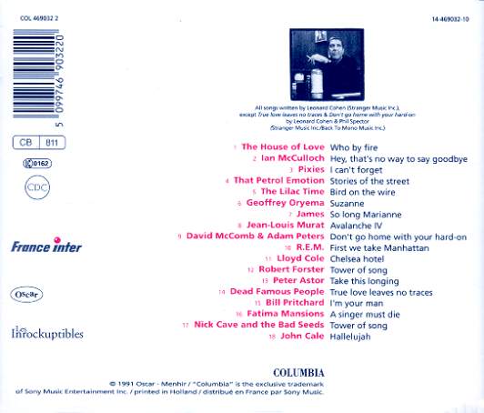 Tracklist: Nick Cave and the Bad Seeds: Tower Of Song/ and tracks by The House Of Love, Ian McCulloch, Pixies, That Petrol Emotion, The Lilac Time, Geoffrey Oryema, James, Jean-Louis Murat, David McComb, R.E.M., Lloyd Cole, Robert Forster, Peter Asto, Dead Famous People, Bill Pritchard, Fatima Mansions & John Cale.