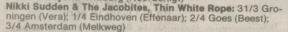 Review: Scan of review of the Groningen gig, taken from Nieuwsblad van het Noorden 01-Apr-88. "Sudden and Thin White Rope let the guitars howls: [...] Heavily distorted guitar chords, a somewhat whiny, fragile voice. A simple accompaniment of bass and drums and all that poured into slow, lingering songs. Unfortunately, the trio was not played-in at all. The drummer in particular was sometimes a mockery. Sudden hasn't lived in England for years, but he appreciates recruiting his group members from the English music industry. And just stepping off the boat onto the stage does not cut it.". 300 in attendance at the Vera gig.