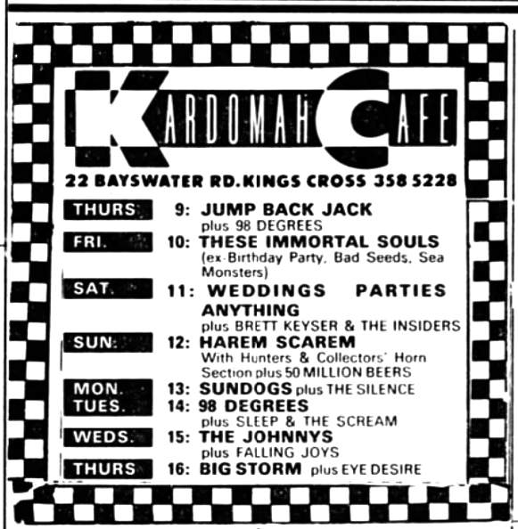 28-Sep-88 Setlist: I Ate The Knife/ "Blood And Sand" She Said/ Hide/ All The Money's Gone/ Marry Me (Lie! Lie!)/ These Immortal Souls/ Hey! Little Child [Alex Chilton]/ Bad/ Some Velvet Morning [Lee Hazlewood]/ Sob Story (Get Lost-Don't Lie!)/ Swing For The Crime [The Saints]/ One In Shadow, One In Sun/ Down On The Street [The Stooges]. |