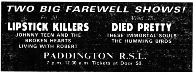 01-Apr-88 Setlist: "Blood And Sand" She Said/ Hide/ These Immortal Souls/ Hey! Little Child [Alex Chilton]/ Marry Me (Lie! Lie!)/ I Ate The Knife/ Some Velvet Morning [Lee Hazlewood]/ Sob Story (Get Lost-Don't Lie!)/ Swing For The Crime [The Saints]/ One In Shadow, One In Sun/ Down On The Street [The Stooges]. |