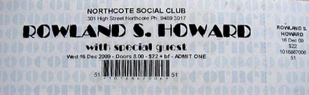 Note: Cancelled due to Rowland's ill health."Rowland S. Howard regretfully has to announce that due to his ongoing serious illness, he has been forced to cancel his performance at The Northcote Social Club (Northcote, Melbourne) scheduled for this Wednesday December 16th. Rowland has asked that apologies be extended to fans who have already bought or who were intending to come along to the show. He hopes to be able to reschedule this performance sometime in the New Year. Patrons who have purchased tickets for this event should take their tickets to the point of purchase in order to arrange a refund."
