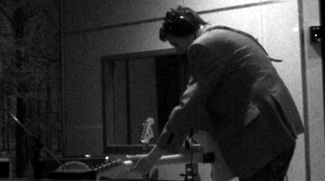 Photo: Rowland tuning his trusted Fender Jaguar before going onstage. Screen capture from "Autoluminiscent", a film by Lynn-Maree Milburn and Richard Lowenstein.