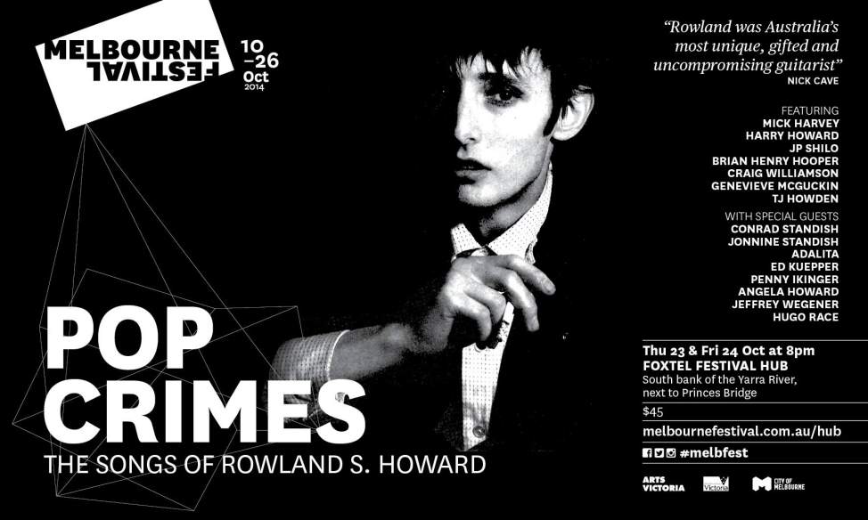 Note: First in the "Pop Crimes" tribute series. Event line-up: Mick Harvey (guitar,drums,vocals)/ Brian Henry Hooper (bass)/ Harry Howard (bass,vocals)/ Tim J.Howden (violin)/ Genevieve McGuckin (keyboards)/ Conrad Standish (vocals)/ Jonnine Standish (vocals)/ JP Shilo (guitar,vocals) and Craig Williamson (drums). Set times on "Stage One @ The Palais: The UV Race: 1.30pm – 2.15pm, The Twerps: 2.45pm – 3.45pm, Pop Crimes – The Songs of Rowland S. Howard: 4.15pm – 5.15pm, Television perform "Marquee Moon" album: 5.45pm – 6.45pm, The Scientists: 7.15pm – 8pm, Fuck Buttons: 8.25pm – 9.15pm and The Breeders perform "Last Splash" album: 9.45pm – 10.45pm.