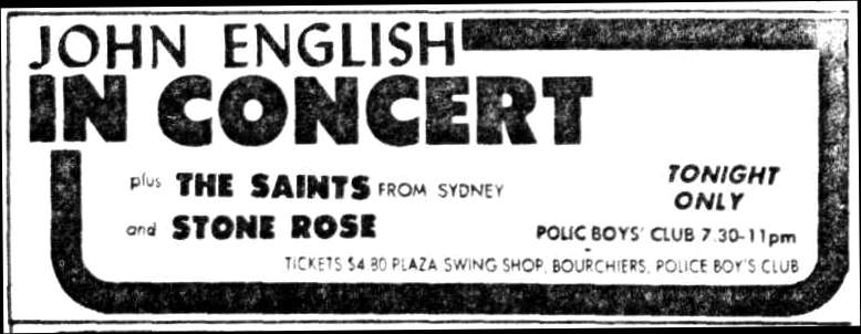 Note 1: Presented by radio 4IP. "I remember The Saints had a residency at Brisbane’s legendary Cloudland Ballroom every Friday night in early 76. I did the MC work as the night was presented by radio 4IP where I worked. The Saints were chaotic, ramshackle, loud and Chris Bailey downed lots of alcohol. Little did I know they were the beginning of Punk Rock. They did a blistering [cover of] "River Deep Mountain High". John Peters Facebook.