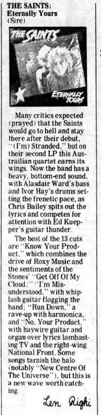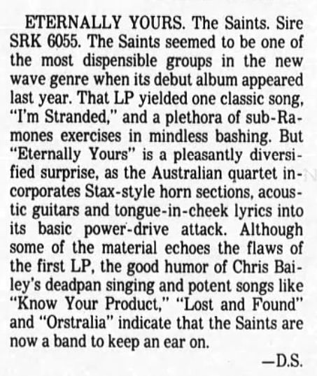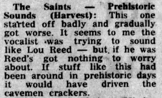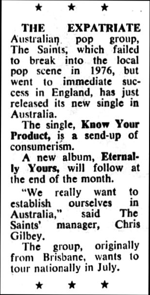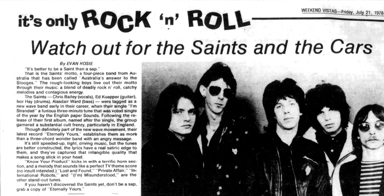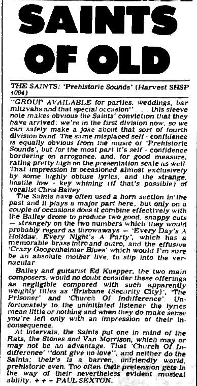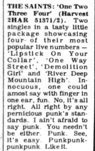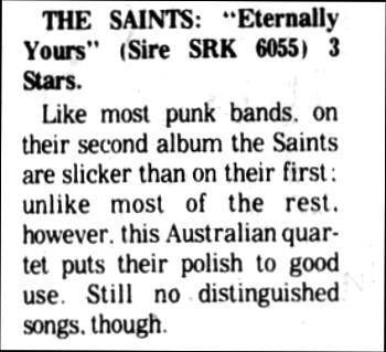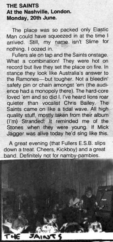 Note 1: "After a couple of months we decided to make another go of it, as the Saints. This time, Ivor changed to drums and we got another bass player and played our first really successful dance. It was on New Year's Eve around a swimming pool and the audience was great." Ed Kuepper in Sniffin' Glue #4 - Punk zine, October 1976.